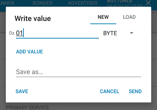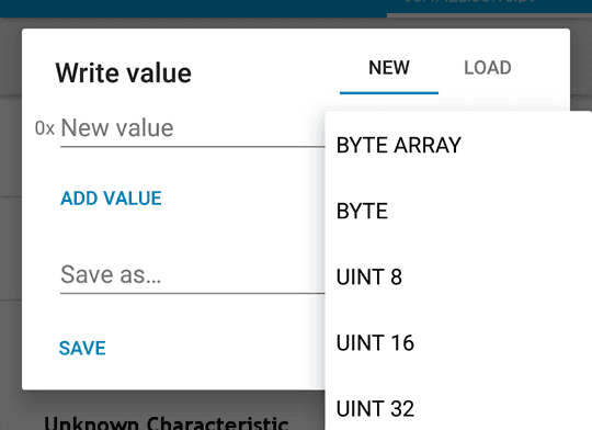 Tap the arrow pointing up in the first Unknown Characteristic to open the Write value popup, then set the data type to BYTE . This will add a small "0x" in front of the input line to show that an HEX format input is needed.