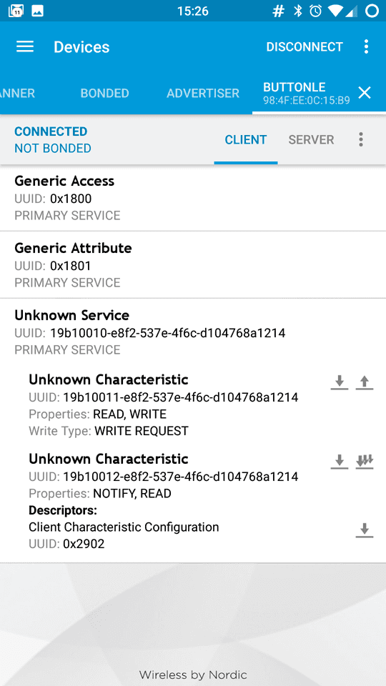 statement at the beginning of the sketch.Tap the Unknown Service to open up its characteristic, as shown below. It includes properties that can be written with a Write Request and properties that can be read and receive notifications. You also find two icons on the right of the first Unknown Characteristic. The arrow pointing down means read, the other means write.