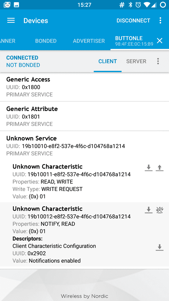 If you tap on the second Unknown Characteristic and you set the rightmost little icon - the one with multiple down arrows - with an "X" on it, you enable notifications. This allows you to see the LED status that changes every time you press or release the pushbutton.