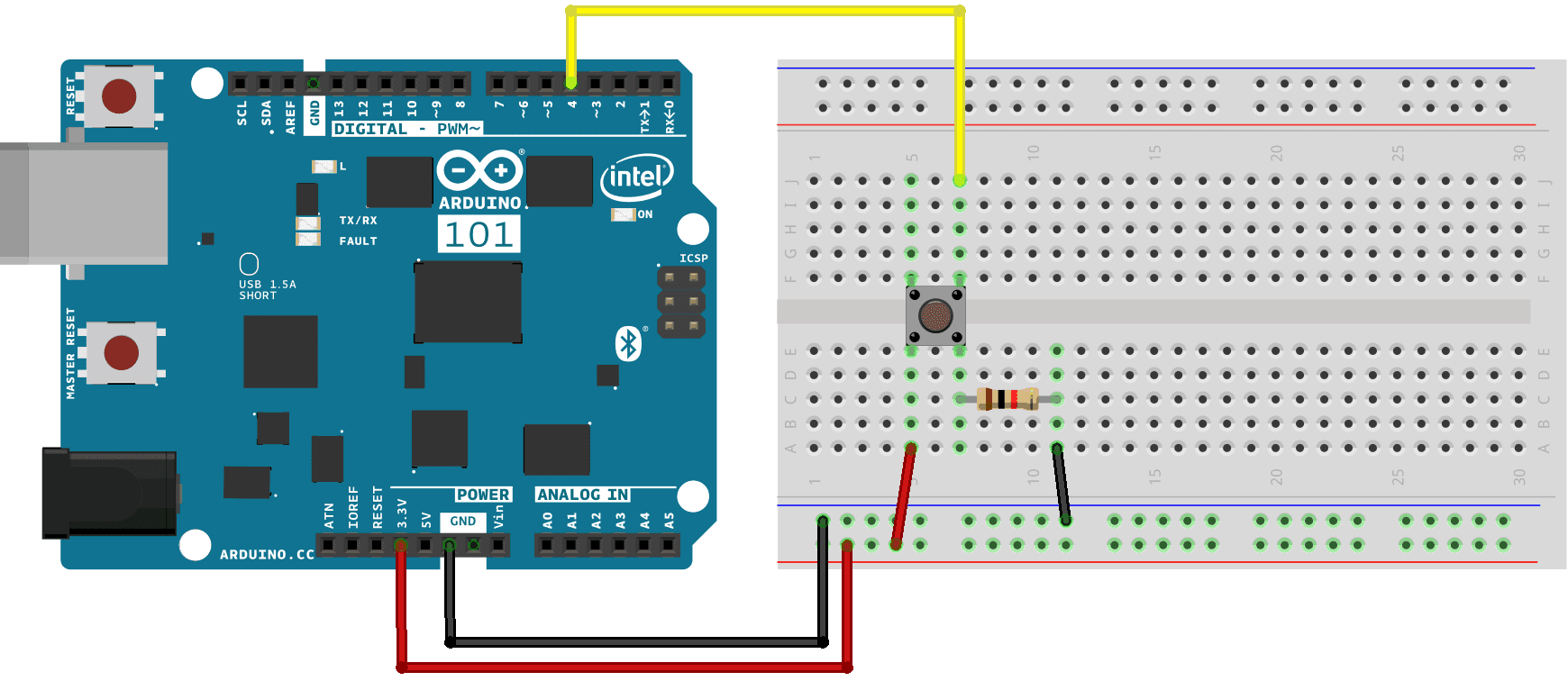 You need to connect a pushbutton to your 101 with a 10k ohm resistor that keeps the level of D4 LOW as long as the pushputton is not pressed. When this happens, the D4 pin is connected to 3.3V and it is read as HIGH.