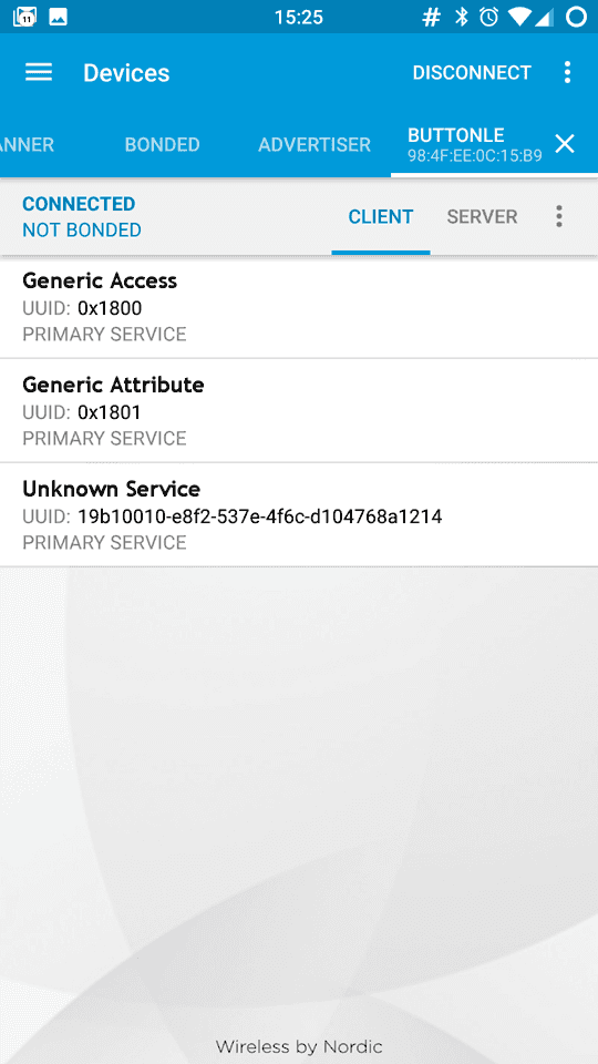 Tap on connect to open the following screen, where you find the description of our Bluetooth® Low Energy service offered by the 101 board. The unknown service has a UUID 19B10000-E8F2-537E-4F6C-D104768A1214 and it is set by the