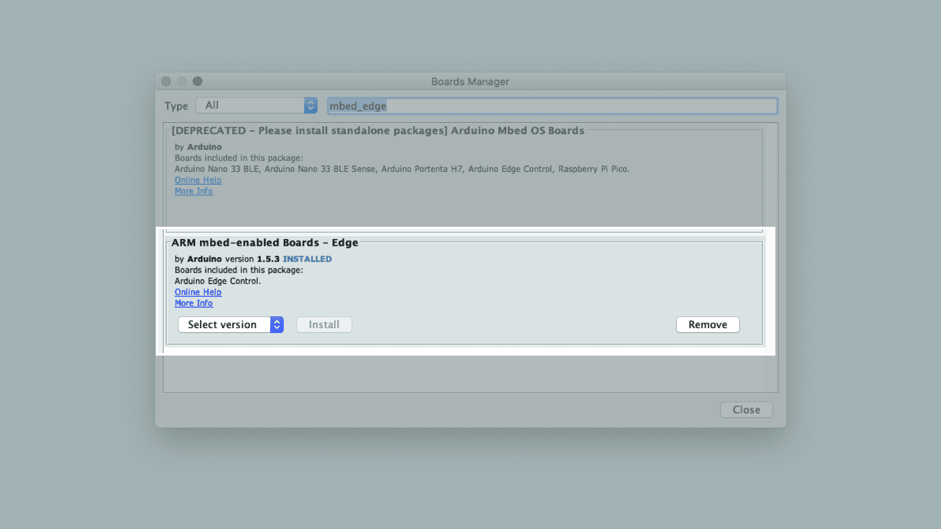 Before you start programming the Edge control board, you will have to download the Mbed core from the board manager. In the Arduino IDE open the Board manager search for the